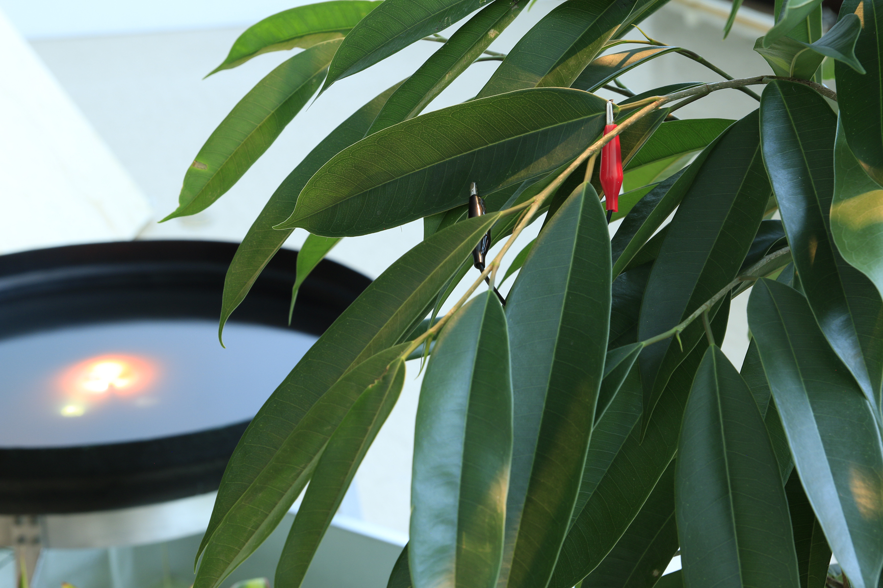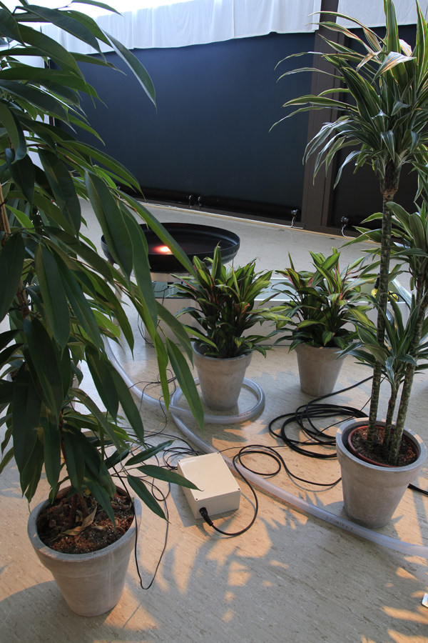 A piece build on two natural systems touching each other in one dynamic point of differnce. The Water has a circular movment, with a headertank as a reservoir. The light comes from the Plants reaction on your precence in the room. The Waterwhirl is illuminated by light produced from the Plants nervous system.