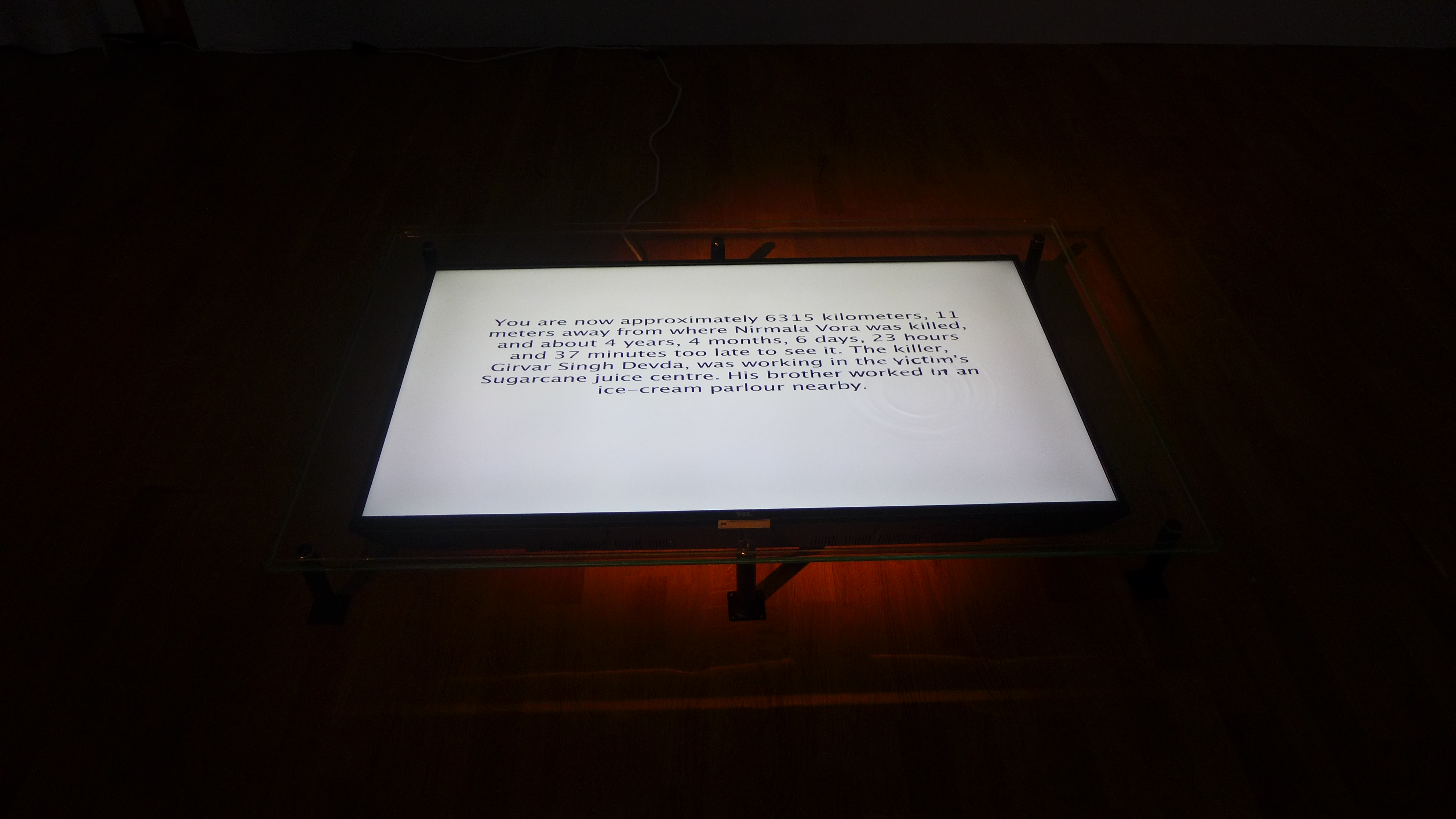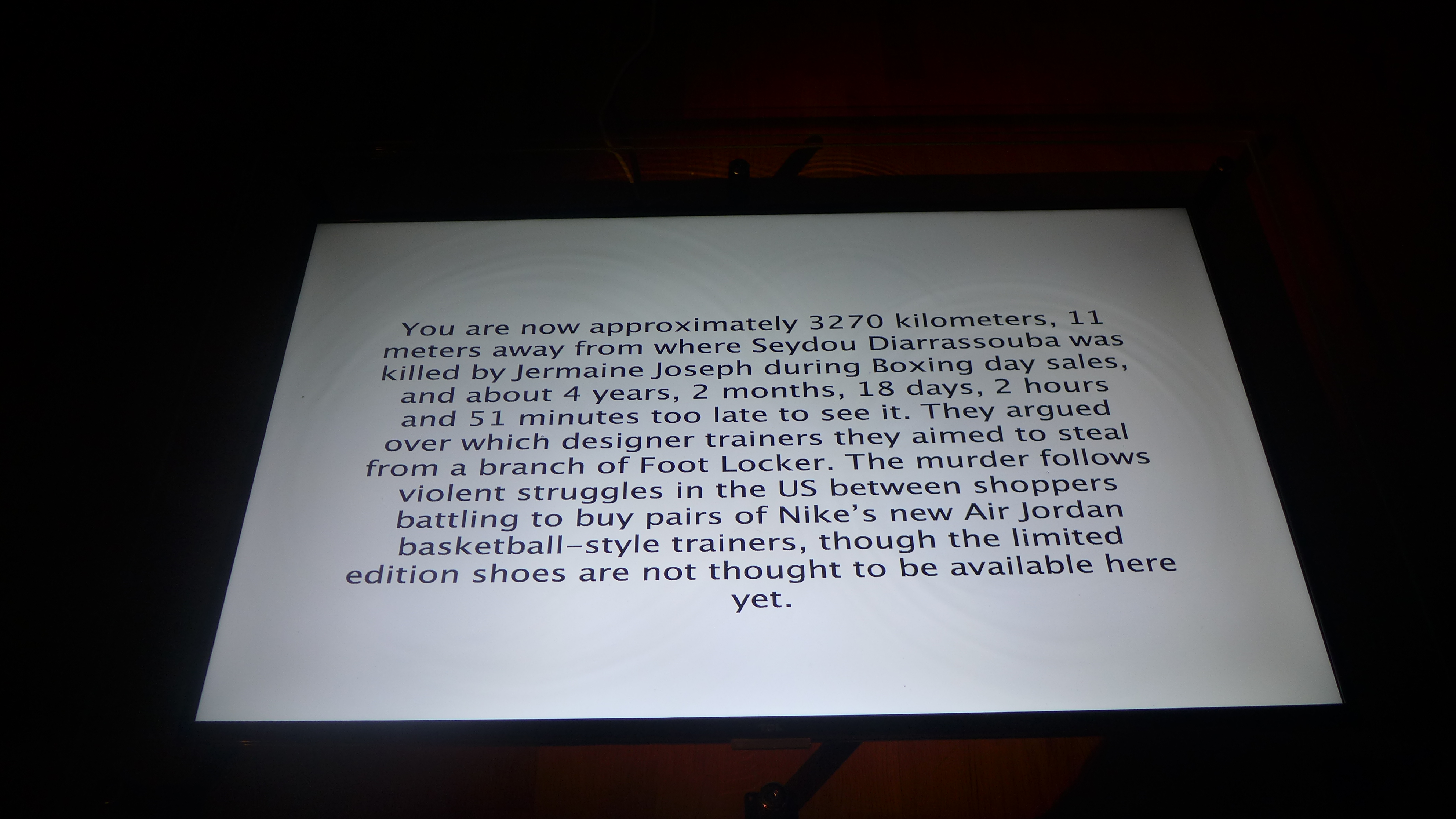 It is based on 37 random murders from around the world. The information is percived from policerecords and local newspapers. You are placed in relation to the crimes, in real time and space, at any given time.